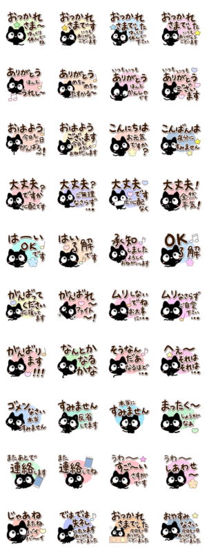『クロネコすたんぷ』の絵文字と着せかえもあります。毎日便利に使える言葉や友達、家族を応援できる黒猫スタンプ。くろねこ好きな方にぜひ。【かたこ】学校/お仕事/ママ友かたこ より発売