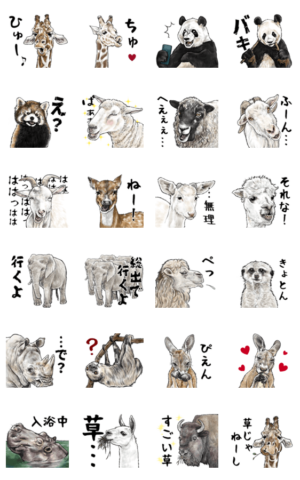 日本の動物園でよく見かける動物のリアクションスタンプ。パンダ・キリン・羊・山羊・レッサーパンダ・ラマ・鹿・ミーアキャット・ラクダ・象・カバ・サイ・アルパカ等