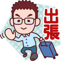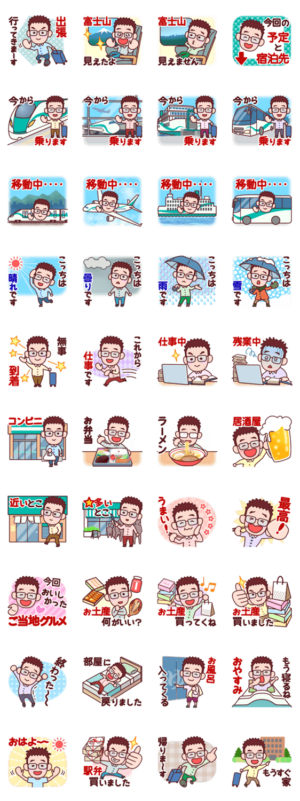 サラリーマンの出張用のスタンプです。(父/パパ/お父さん/仕事/ビジネス/家族/男/挨拶/予定/宿泊先/電車/飛行機/フェリー/バス/ご当地料理/食事/お土産)