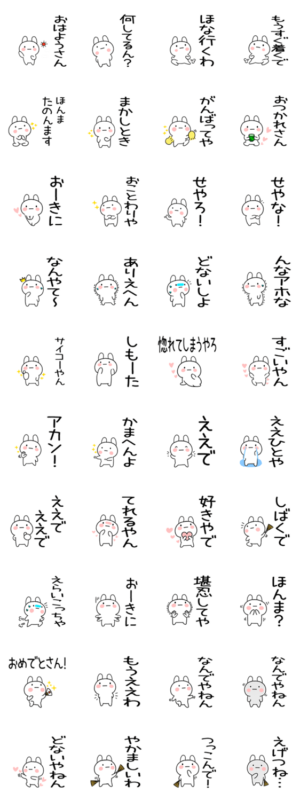 日常で無難に毎日使える関西弁を選びました。関西弁:かんさいべんをしゃべる「関西弁うさぎ」スタンプです。しろくてまるいキャラクターです。(もるきゅた作)