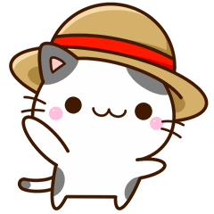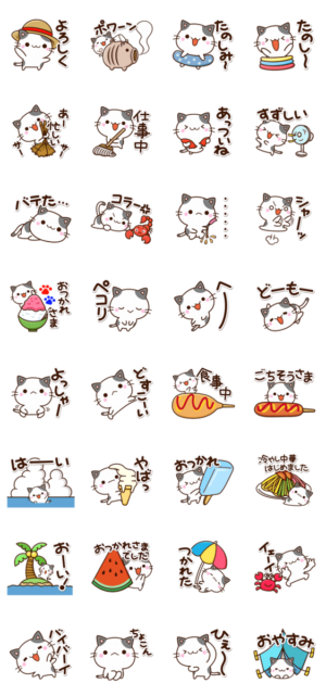 ぶち猫の『ちびブチ』の夏の雰囲気のネコスタンプ。スイカ・アイス・冷やし中華・プール・浮き輪・アウトドア等、夏を連想させるものを集めた、ねこスタンプ。【かたこ】かたこ より発売