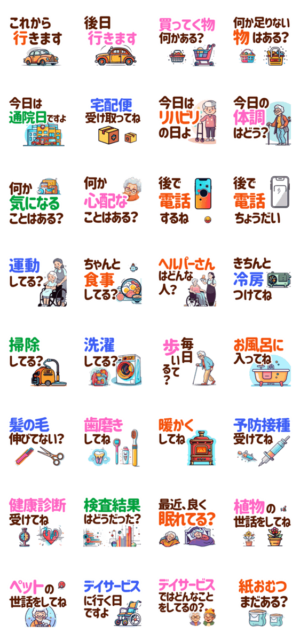 高齢者家族への連絡用スタンプです。高齢者が見やすいように文字を大きくしています。高齢者へ普段から気をつけたいことをピックアップしました。あんずの子 より発売