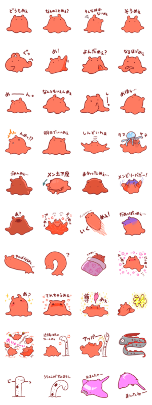 メンメンメンダコドッコイショの歌でおなじみメンダコたちの落書きイラスト風スタンプです。メンダコたちの独特の語尾で会話しよう!