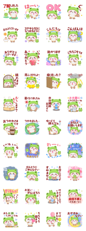 かえるの頭巾をかぶったかわいいパンダさんの初夏の日常に使いやすい言葉を集めました。めぐみん より発売