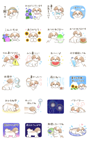 可愛いシーズーちゃんのスタンプです。夏の日常会話におすすめ☆夏・夏休み・梅雨・花火・猛暑・暑いpiiko より発売