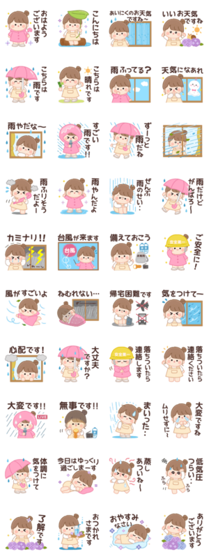 おだんごヘアーの可愛い女の子です。梅雨の季節にたくさん使えるお天気スタンプです。災害/豪雨/台風/雨の日/雷/シンプル/ナチュラル/生活/暮らし/