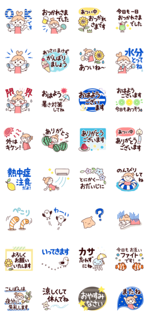 初夏から真夏にも毎日使える!シンプルなので大人女子も日常生活で自然に使いやすいスタンプです。熱中症予防の水分とってねや暑い中お疲れさまなど。夏っぽい生き物も