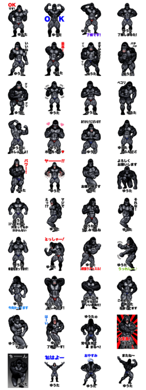 ボディビルのポージングなどを使った、日常会話で使える ゴリラと筋肉好きの為の、筋肉 マッチョ マッスル ゴリラスタンプです。 身近な ユウタさんへのプレゼントにも!