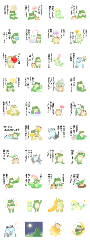 長文敬語スタンプです。 ちょっと丁寧な日常会話で使えます。 カエル好きさんにどうぞ。たろ より発売