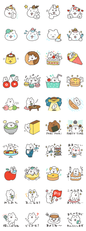 みんなだいすき おやつの時間! たくさんのお菓子やくだものに囲まれながら 甘めの毎日を過ごす すこやかなしろくまのスタンプです。かわしまさき より発売