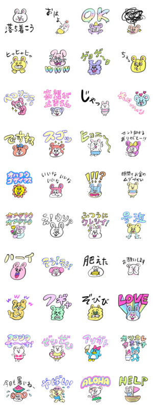 レトロかわいいシュールなスタンプです。デカ文字、夏仕様、どこかトロピカルな色合い。人畜無害な幼児体型小動物キャラで使う場所を選ばない!
