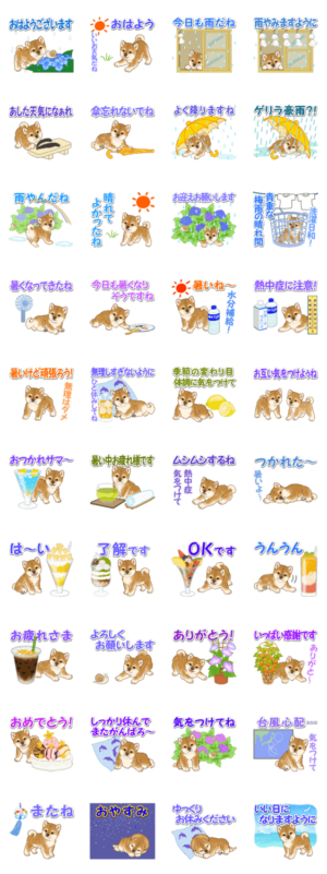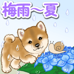 ころころもふもふの柴犬の子犬のリアル寄りの画像に、雨や暑さへの気遣いの言葉と、紫陽花・朝顔・てるてる坊主・カタツムリ・冷たい物等を添えて。文字大き目です。つのっち より発売