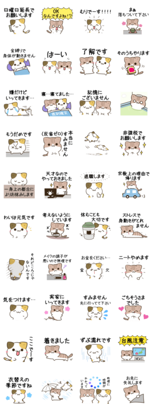 お疲れ気味やる気が出ない時に!ゆるかわ三毛猫とキジトラ白猫の敬語スタンプ 仕事 社畜 気づかい 春夏秋冬 梅雨 連絡 家族 低気圧 ストレス 布団 台風 天気 蕎麦 食パン