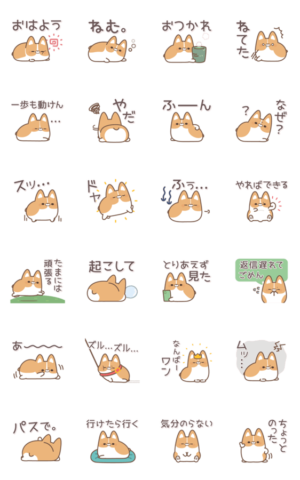 全然やる気がないコーギーのだらっとしたスタンプです。 少しだけ頑張ってリアクションしてくれます。DECOR より発売