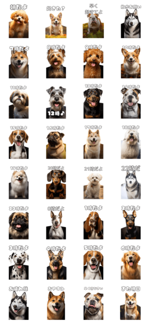 可愛い犬たちが時間をお知らせします! 大事な人を起こしたり、待ち合わせの時間に使えます♪♪ ※このスタンプはトークルームで大きく表示されるBIGスタンプです。Meru02 より発売