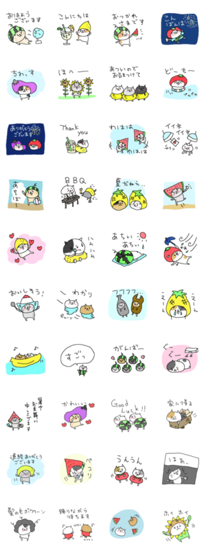 にしおかあきの夏の被り物ネコさんスタンプです。今日もゆるりとくすっとくるねこさんたち。敬語もたくさんデカ文字で使いやすいスタンプです。 プレゼントにも!にしおかあき より発売