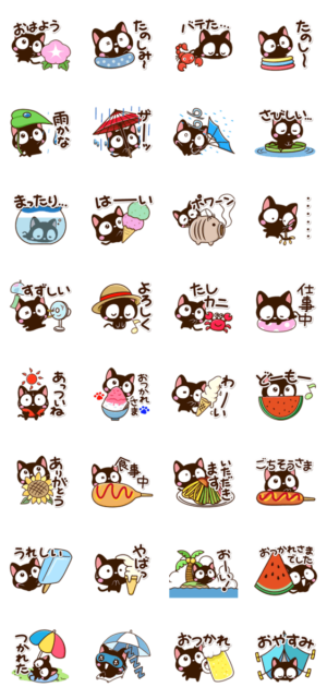 『小さい黒猫』の夏の暑い時期に使いやすいクロネコスタンプ。かわいい、くろねこ好きな方に絵文字と着せかえと合わせてぜひ。【かたこ】ひまわり・猛暑・あさがお・アイスかたこ より発売