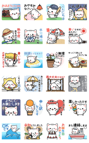 アメリカンショートヘアーのアメちゃんの夏スタンプ♪ 大雨や台風、猛暑の時に使いやすい敬語のスタンプです。