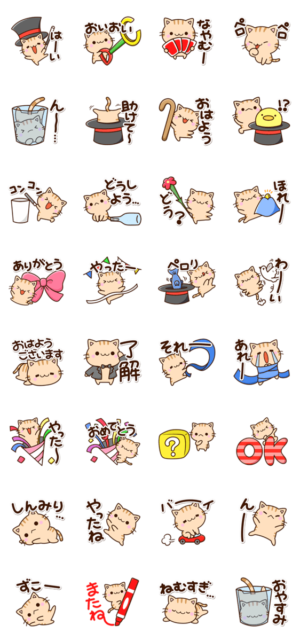 『ちびトラ』の手品・マジックスタンプ。明るく楽しく返事をしたいときに便利な虎猫スタンプ。絵文字と着せかえもあります。【かたこ】茶とらねこ・保護猫・マンチカンかたこ より発売