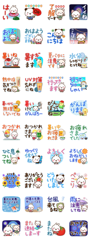 冷たい食べ物や和柄、海や山、花火で暑い夏を盛り上げます!かわいいうさぎ、ねこ、パンダ、くま、鳥が登場♡梅雨/台風/敬語/夏休みや暑中見舞い、残暑お見舞いにもOK♪