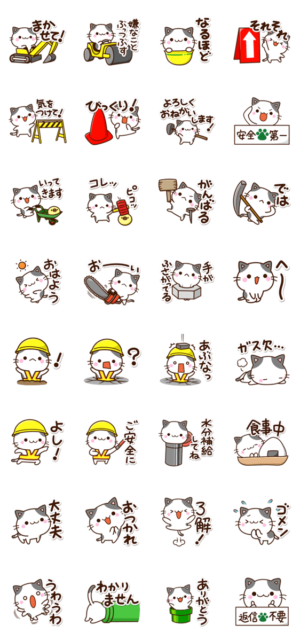 かわいいブチねこの工事現場風スタンプ。ハチワレ、保護猫、マンチカン等、ネコ好きな方にぜひ。【かたこ】お仕事・毎日便利・安全第一・スコティッシュフォールド・作業かたこ より発売