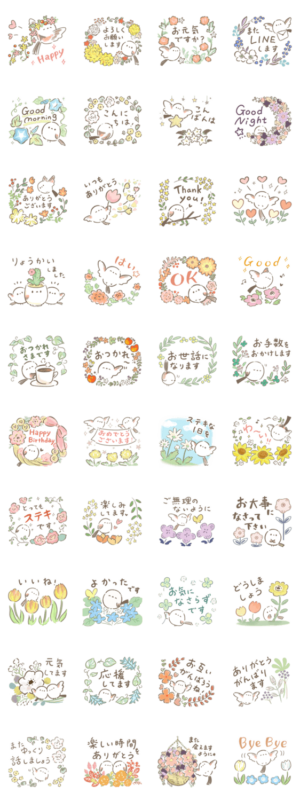 花と緑に囲まれたシマエナガのスタンプです。日常会話に使いやすい挨拶からお祝いまで♫敬語多め しまえなが/植物/オシャレ/白い鳥/小鳥/ナチュラルなかむらさやか より発売