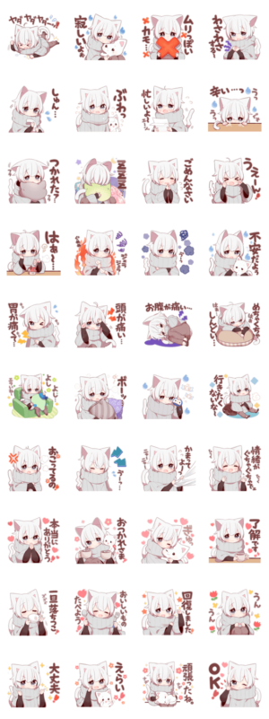 いつもよりちょっとネガティブで、お疲れなねこさんのスタンプです。疲れ気味な日常会話やリアクション、挨拶の言葉が入っています。お友達や家族、恋人との会話にも是非。