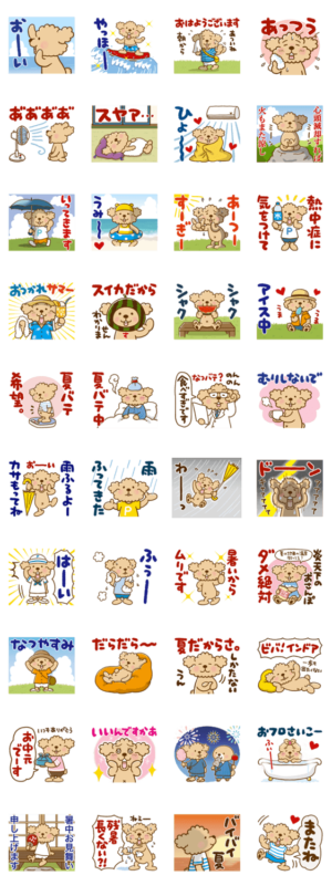 トイプードルのぷう太郎の暑い夏に使いやすいスタンプです。夏/暑い日/夏の食べ物/台風/豪雨/暑中見舞い/残暑/夏祭り/夏の風物詩satoco より発売