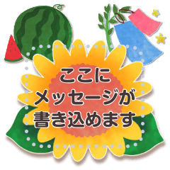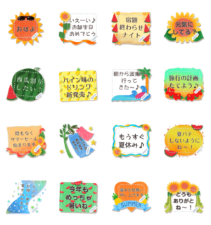 向日葵/西瓜/太陽/サングラス/サーフィン/海/波/七夕/短冊/天の川/宇宙/パイン/ハイビスカスなど自由に文章が書き込めるポップで可愛い夏のメッセージスタンプです♪ 現在この商品は一部のスマートフォン版LINE 10.3.0以上のトークルームでのみ使用できます。動作環境の最新情報はヘルプをご確認ください。れなし より発売