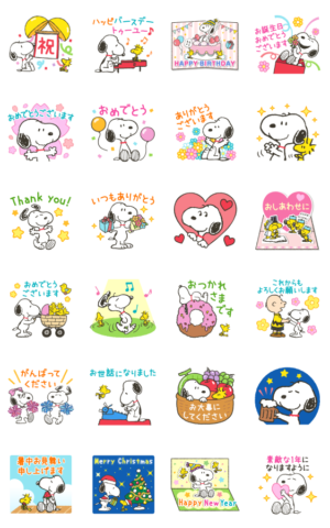 毎年のイベントごとに使えて便利なスタンプ。万人受けするスヌーピーがイベントの挨拶してくれます。