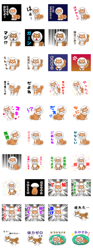 エリザベスカラーを装着され、絶望の淵に突き落とされた柴犬サブロウの日常スタンプです。はるもも より発売