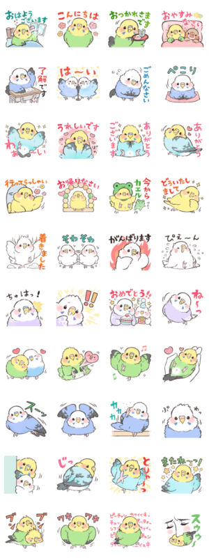 ふわふわ、元気いっぱいセキセイインコちゃんのスタンプです。鳥野ニーナ より発売