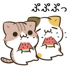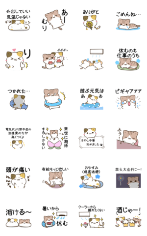 お疲れ気味 やる気が出ない時に使えるゆるかわ三毛猫とキジトラ白猫のアニメーションスタンプ 仕事 体調不良 春夏秋冬 スイカ 花火 海 熱中症 ビール かき氷 向日葵
