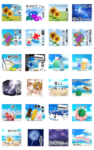 大人が使いやすいキャラクター無しでシンプル!だからずっと使える!夏のあいさつ、優しい敬語/可愛い夏の花ひまわり/文末に使いやすい文字無しもあります。