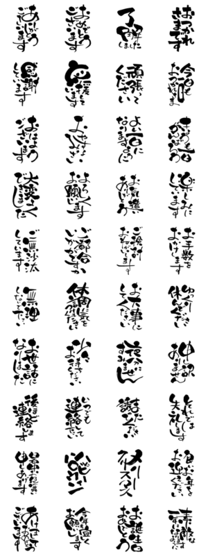 達筆な書体で丁寧な定型文を送ることができるスタンプです。文字が大きいので老眼でも安心♪丁寧な会話、習字、筆、敬語、新年の挨拶、クリスマス、ハロウィン、誕生日。 ※このスタンプはトークルームで大きく表示されるBIGスタンプです。くーが より発売