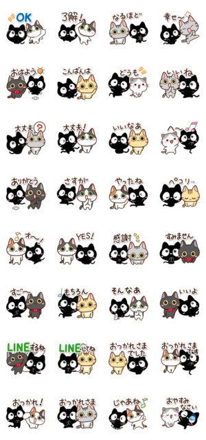 『クロネコすたんぷ』と三毛猫、ハチワレねこ等のブチネコが登場するかわいいスタンプ。毎日便利に使えるあいさつもあります。【かたこ】トラネコ・アメショ・サバトラ