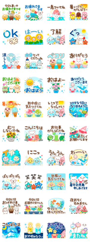 仲良しの子たちが手と手を取り合う、優しさと気遣いのスタンプです。夏のスイーツや海の生き物に彩られた大文字の挨拶スタンプです。暑中見舞いにも。
