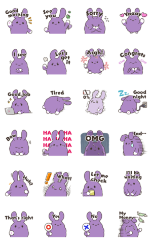 むらさき色のゆるもふうさぎ「もりうさ」の英語版LINEスタンプです。