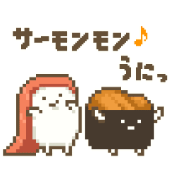 YouTubeアニメ「回転ずしくん」より、ダンスの相棒サーモン&うにオンリーのドット絵アニメーションスタンプです!日常会話で使いやすいあいづちやあいさつ中心に収録。
