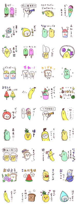 ぼくとクマとゆかいな仲間たちのカジュアルなスタンプセットです。パイナップル/バナナ/かき氷/アイス/ダジャレ/スイカ/食パン/梨/敬語/ネガティブ/だけどポジティブ