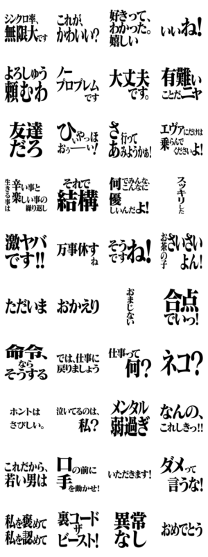 大人気「エヴァ文字」の第2弾が登場!今回は『シン・エヴァンゲリオン劇場版』の名セリフを中心にラインナップ。お気に入りのセリフで会話をさらに盛り上げよう!