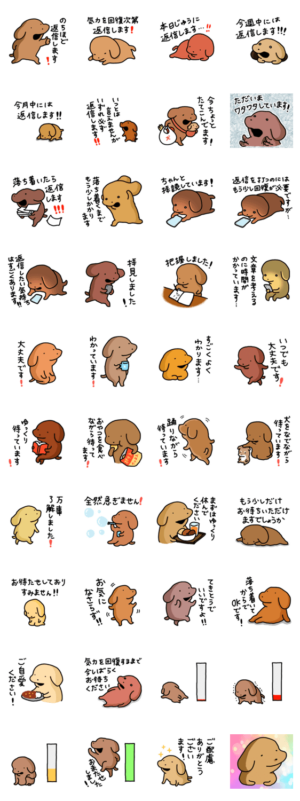 「事情により今すぐには返信できないが、いずれ返信するつもりでいる」という気持ちを伝える犬たちのスタンプです。 ※LSCP:LINE Creators Support Programうかうか より発売