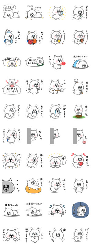 うるうる目のゆるうさぎのスタンプです。家族、友達、彼氏彼女、先輩後輩、ママ友、会社の同僚...色々な人とのトークに使ってみてください。chococo より発売