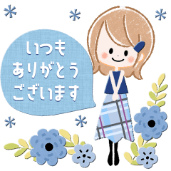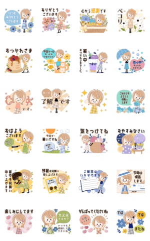 セミロングヘアの大人ガールの可愛いスタンプです。気遣いや感謝のメッセージ多めの大人の女性が使いやすいスタンプです。