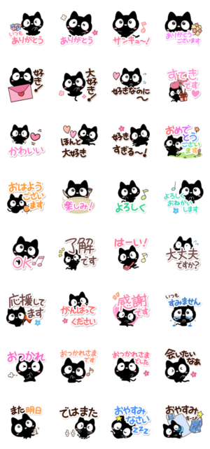 『クロネコすたんぷ』の相手に気持ちを伝えるのに便利なスタンプ。ていねいな言葉や気軽に話せる言葉等、毎日使える黒猫スタンプ。【かたこ】可愛いくろねこ・友達・恋人