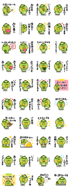 かっぱさんのやさしい気遣いのスタンプです。ずっと内容を揃えましたのでスタンプ初心者の方にもオススメです。【作:いしいともこ】