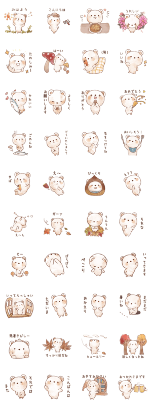 白くまちゃんの秋に使える日常スタンプです。水彩画で優しいイラストになっています。挨拶/かわいい/パステル/ほんわか/癒しなお&リリーベル より発売