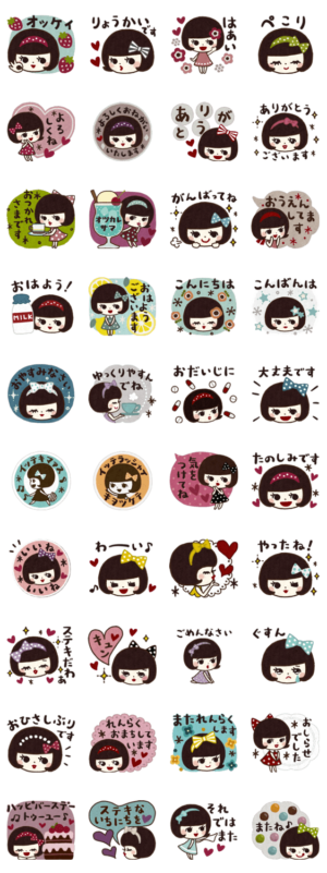 レトロ風味のおしゃれ好きな女の子のスタンプです。敬語ありの日常に使いやすいセットになってます。ちょっとだけ誕生日用も。大人女子に~♪nanaya より発売