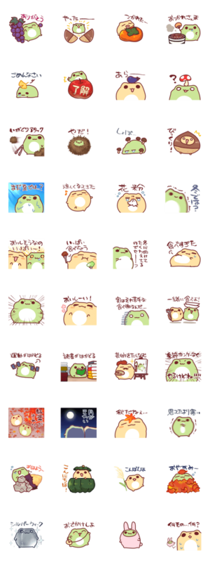 ころころとした大福のようなカエルの秋をテーマにしたスタンプです。しろくろ より発売