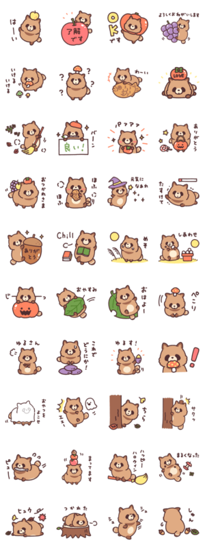 のんびりたぬきの毎日使える秋スタンプです。ほっこり秋の食べ物やハロウィン、お月見などイベントも! 秋を過ぎても使えるタヌキらしいモチーフがたくさん入っています。つじなつみ より発売